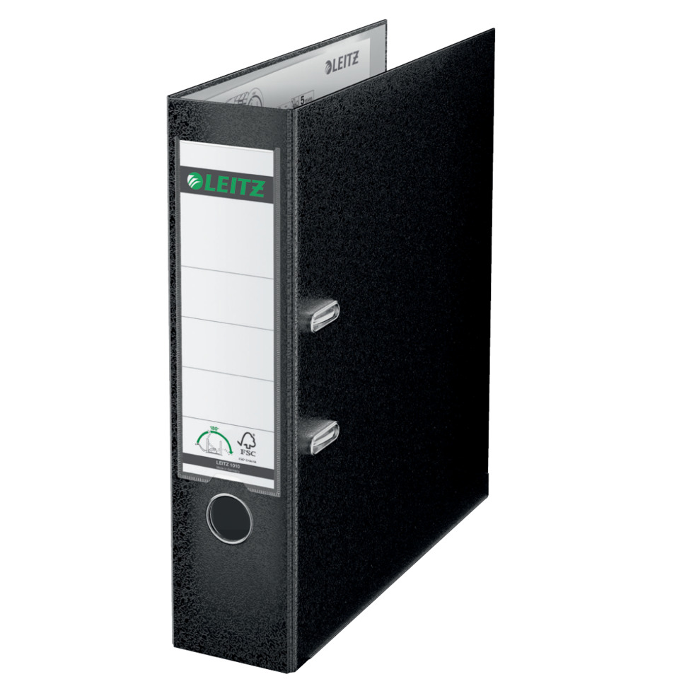 Leitz Qualitäts-Ordner Plastik breit. Äußerst widerstandsfähiger und schmutzabweisender Einband aus 30% vor Gebrauch recycelter PP-Folie außen und PE-laminiertem Papier auf der Innenseite auf stabilem, zu 90% recyceltem Karton für längere Lebensdauer. Mit patentierter 180°-Präzisionsmechanik für 50% weiteres Öffnen und 20% schnelleres Arbeiten. Mit Schlitzen, Griffloch und Kantenschutz. Mit Sichttasche (PP) am Rücken. Mit auswechselbarem Rückenschild. Für bis zu 600 Blatt (80 g/qm). Material: Einband aus 90% recyceltem Karton, mit 30% vor Gebrauch recycelter Polypropylen-Folie kaschiert, innen Polyethylen-beschichtetes Papier. Format: für DIN A4, 285 x 318 mm, Rückenbreite: 80 mm. Für bis zu 600 Blatt (80 g/qm). 5 Jahre Garantie auf die Mechanik. GS-geprüft. Farbe: schwarz.