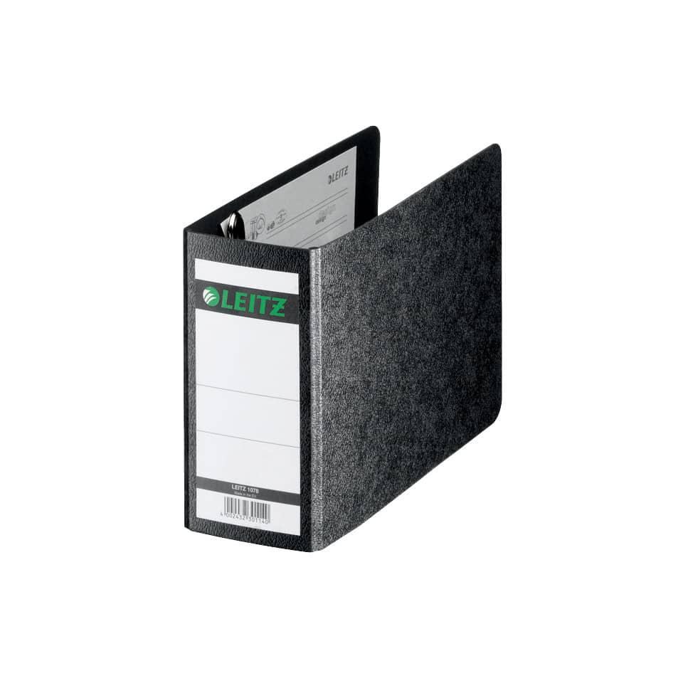 Ordner Hartpappe A6 quer, mit Präzisionsmechanik. Ohne Schlitze, ohne Griffloch, ohne Kantenschutz, mit Deckblatt, mit aufgeklebtem Rückenschild. Material: Einband aus Pappe (RC), mit Wolkenmarmorpapier (RC) kaschiert. Format: für A6 quer, 150 x 217 mm, Rückenbreite: 77 mm. Farbe: schwarz.