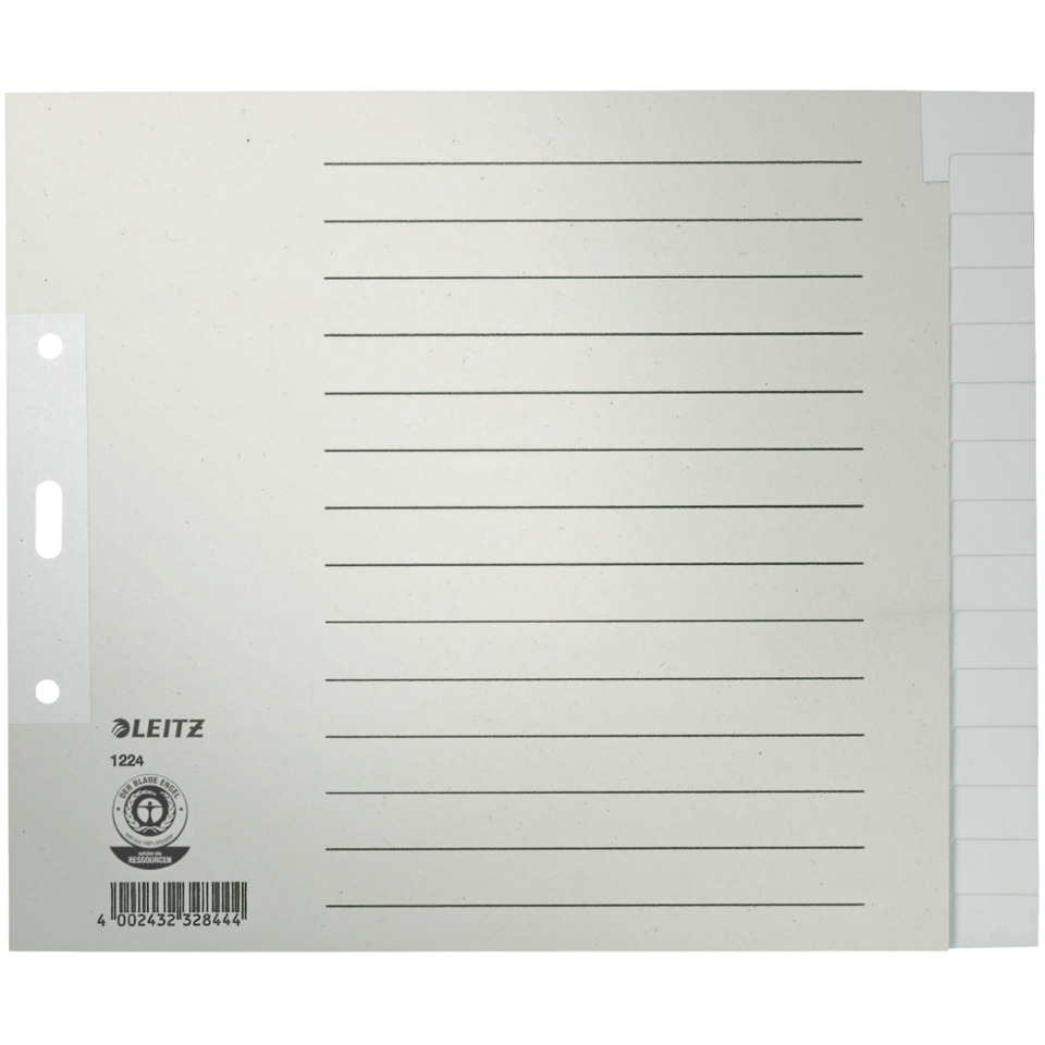 Papierregister Blanko, A4, Überbreite. Mit Lochverstärkung des 1. Blattes und Tabenverstärkung, mit Liniendruck auf dem 1. Blatt und 8 cm Lochung. Material: Tauenpapier 100 g/qm (RC). Blattanzahl: 15. Format: 240 x 200 mm. Farbe: grau.