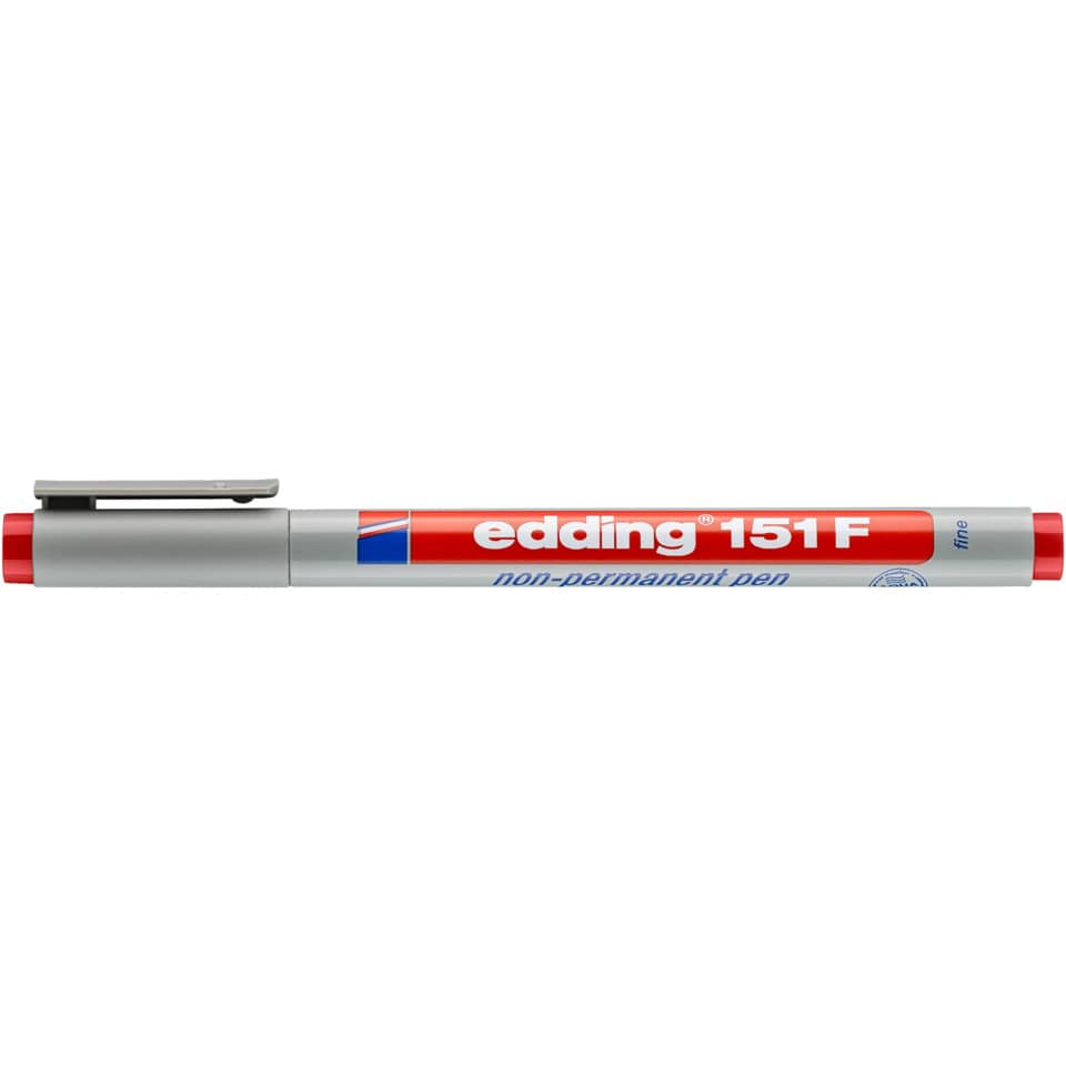 Non-permanent Pen edding 151 F. Folienschreiber mit Rundspitze speziell zur Beschriftung von Kunststoff-Folien unter anderem OHP-Folien, sowie vielen anderen Materialien, wie z.B. Glas. Wischfeste, wasserlösliche, schnelltrocknende Tinte. Feucht abwischbar von fast allen geschlossenen Oberflächen. Hellgraue Kappe mit Kunststoffclip. Schaftfarbe: hellgrau. Strichstärke: 0,6 mm. Schreibfarbe: rot.