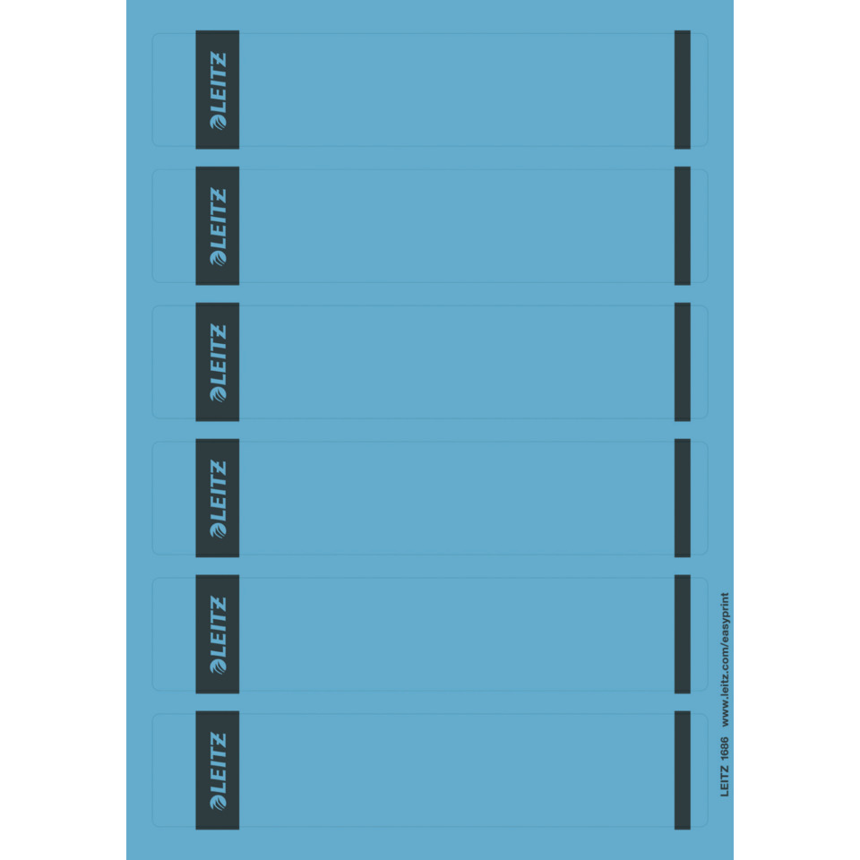 Rückenschild, selbstklebend, kurz, schmal, PC-beschriftbar, auf A4-Papier, für Standard- und Hartpappe-Ordner, hohe Deck- und Klebekraft, mit Greifrand, für Laser-, Tintenstrahldrucker und Kopiergeräte, lösungsmittelfrei. Material: Papier. Format: 39 x 191 mm. Inhalt: 150 Stück. Farbe: blau.