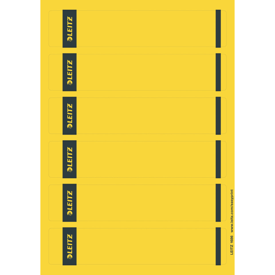 Rückenschild, selbstklebend, kurz, schmal, PC-beschriftbar, auf A4-Papier, für Standard- und Hartpappe-Ordner, hohe Deck- und Klebekraft, mit Greifrand, für Laser-, Tintenstrahldrucker und Kopiergeräte, lösungsmittelfrei. Material: Papier. Format: 39 x 191 mm. Inhalt: 150 Stück. Farbe: gelb.