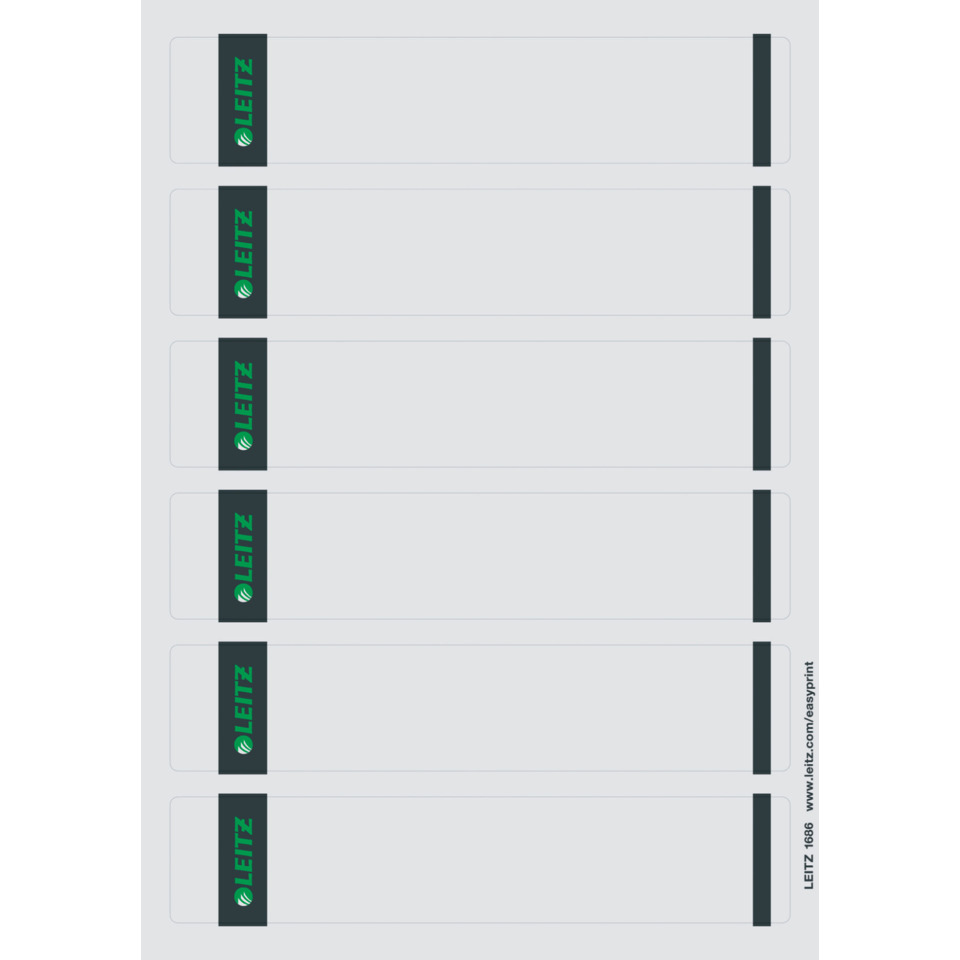 Rückenschild, selbstklebend, kurz, schmal, PC-beschriftbar, auf A4-Papier, für Standard- und Hartpappe-Ordner, hohe Deck- und Klebekraft, mit Greifrand, für Laser-, Tintenstrahldrucker und Kopiergeräte, lösungsmittelfrei. Material: Papier. Format: 39 x 191 mm. Inhalt: 150 Stück. Farbe: grau.