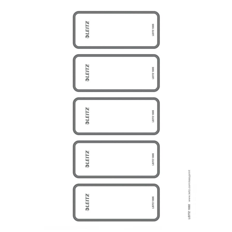 Leitz PC-beschriftbares und selbsklebendes Rückenschilder für Leitz Wow Qualitäts-Ordner 180° (1005). Die PC-beschriftbaren Rückenschilder sorgen für eine übersichtliche Organisation im Regal. Mit dem nutzerfreundlichen und webbasierten Programm Easyprint lassen sich die Rückenschilder nach individuellen Bedürfnissen schnell und einfach gestalten und ausdrucken. Kurze, breite und selbstklebende Rückenschilder für eine einfache Positionierung auf dem Ordnerrücken. A4 Blätter mit Greifrand und einzelnen Rückenschildern mit hoher Deck- und Klebekraft für ein perfektes Erscheinungsbild.