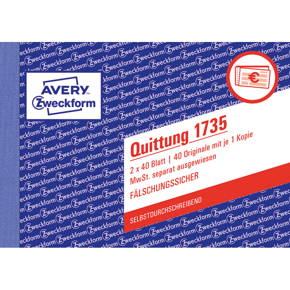 Bestätigen Sie den Verkauf von Waren oder Dienstleistungen mit den Quittungen von Avery Zweckform. Die Quittung, MwSt. separat ausgewiesen, im A6 Querformat ist mit einem feinen, netzartigen Hintergrunddruck ausgestattet. Somit ist die Quittung garantiert Fälschungssicher. Profitieren Sie von der langjährigen Erfahrung vom Formularexperten Avery Zweckform.