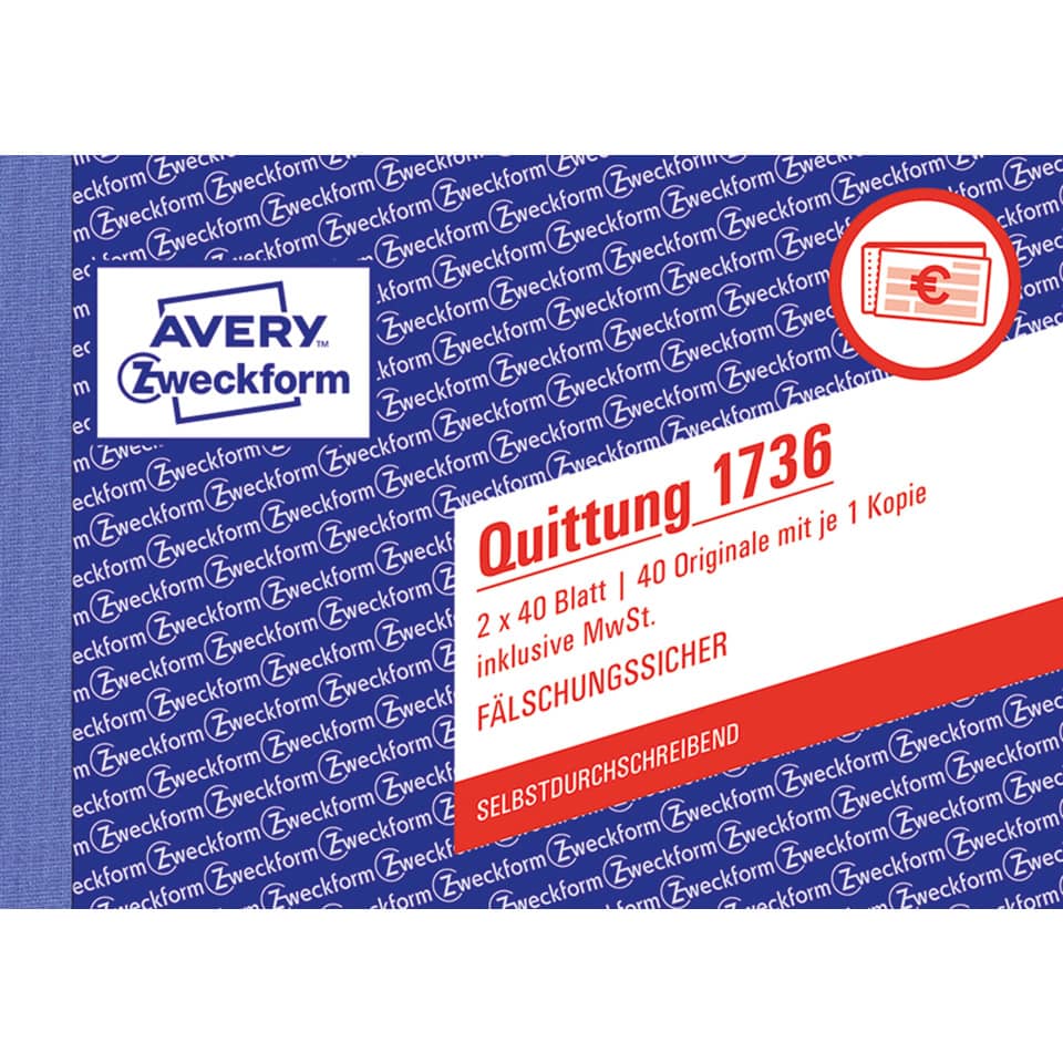Bestätigen Sie den Verkauf von Waren oder Dienstleistungen mit den Quittungen von Avery Zweckform. Die Quittung, inklusive MwSt., im A6 Querformat ist mit einem feinen, netzartigen Hintergrunddruck ausgestattet. Somit ist die Quittung garantiert Fälschungssicher. Profitieren Sie von der langjährigen Erfahrung vom Formularexperten Avery Zweckform.
