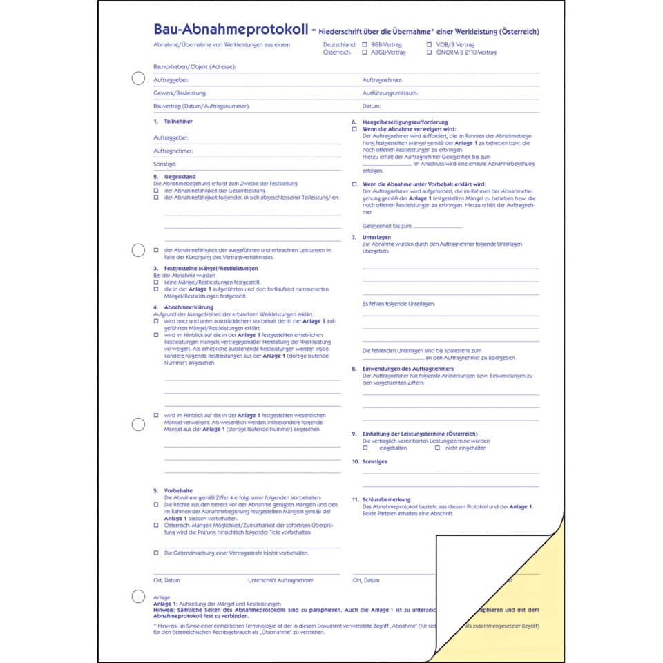 Bauabnahmeprotokoll inkl. Mängelliste. Ausführung Papier: 56 g/qm, chlorfrei gebleicht, Klebebindung. Verwendung für Beschriftungsart: handbeschriftbar. Abnahme von Bau- und Werkleistungen nach BGB und VOB/B Verträge. 32 Bauabnahmeprotokolle mit je einem Durchschlag inkl. Mängelliste. Ausführung: selbstdurchschreibend, Abheftlochung vorhanden, Microperforation. Ausführung Durchschlag: 2 Blatt, gelb. Papierformat: DIN A4 = 21,0 cm x 29,7 cm. Anzahl der Blätter: 2×32 Blatt.