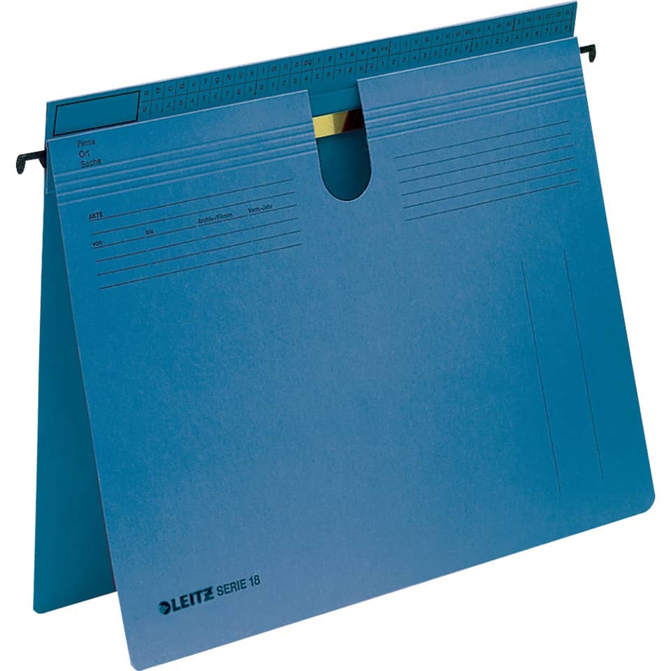 Hängehefter SERIE 18, für kaufmännische Heftung und Amtsheftung. Für die geheftete Ablage von Einzelakten. Überstehender Reiterfalz mit Organisationsdruck, links vorgedrucktes Feld für Beschriftung, auch geeignet für Farbcodierung mit OCplus Beschriftungsetiketten. Mit fest eingezacktem Aufreihband und Daumenausschnitt. Material: Manilakarton 250 g/qm (RC). Für A4. Farbe: blau.