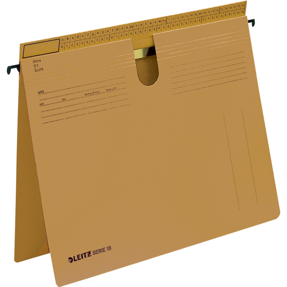 Hängehefter SERIE 18, für kaufmännische Heftung und Amtsheftung. Für die geheftete Ablage von Einzelakten. Überstehender Reiterfalz mit Organisationsdruck, links vorgedrucktes Feld für Beschriftung, auch geeignet für Farbcodierung mit OCplus Beschriftungsetiketten. Mit fest eingezacktem Aufreihband und Daumenausschnitt. Material: Natronkarton 250 g/qm (RC). Für A4. Farbe: naturbraun.