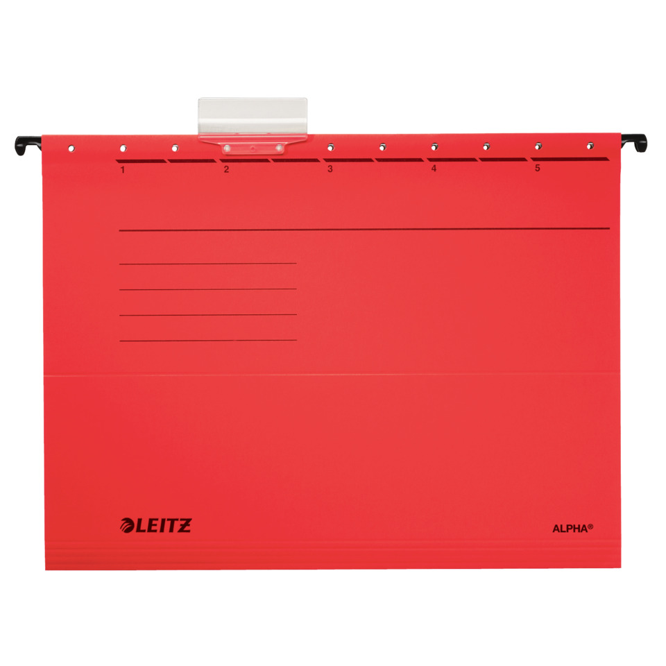 Leitz Hängemappe ALPHA®, seitlich offen. Für Loseblatt-Ablage von Einzelakten. Mit Schlitzstanzung für Einsteckheftstreifen (6130), Hängeschiene mit kunststoffumsinterten Hängenasen, Vollsichtreiter und auswechselbaren Blanko-Schildchen. Mit Falzungen für eine individuelle Einstellung auf die Inhaltsmenge. Material: 100% Pendarec-Karton 275 g/qm (RC). Für A4. Farbe: rot.