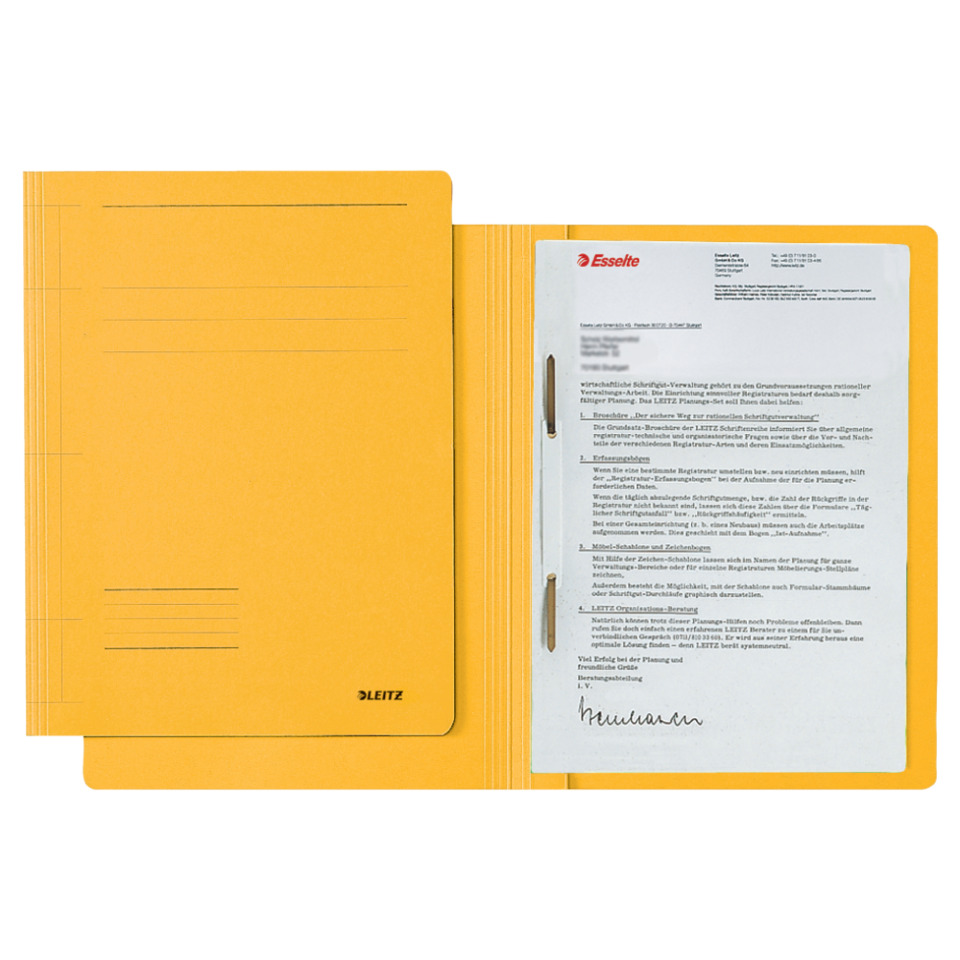 Leitz Schnellhefter Fresh, für kaufmännische Heftung oder Amtsheftung. Vorderdeckel mit Beschriftungslinien, Schnellheftmechanik mit goldlackiertem Aufreihband und weißer Kunststoff-Deckschiene auf beweglichem Heftfalz, genormt nach DIN 821. Material: Pendarec-Karton 250 g/qm (RC). Format: 240 x 318 mm, für A4. Farbe: gelb.