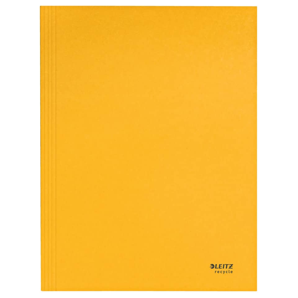 Leitz Jurismappe Recycle. Hergestellt aus zu 100% recyceltem Karton und zu 100% recycelbar. Langlebig und robust. Mit 3 vollflächig verklebten Klappen am Unterdeckel. Kein Verpackungsabfall, Kennzeichnung nur mittels Etikett. Material: 100% recycelter Karton 430 g/qm (RC). Kapazität: bis zu 250 Blatt DIN A4. Format: für DIN A4, 242 x 318 mm. Farbe: gelb.