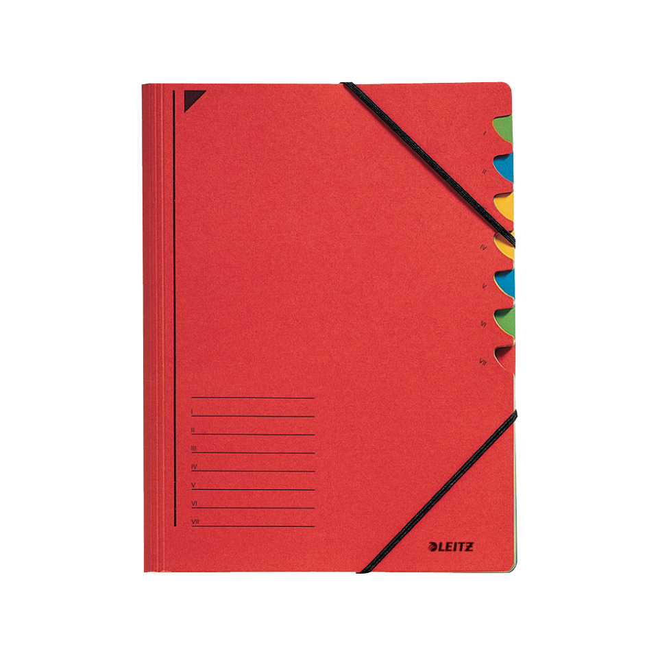 Leitz Ordnungsmappe mit 7 Fächern. Einband aus hochwertigem 430 g/qm zu 100 % recyceltem Pendarec-Karton. Fächerblock aus 350 g/qm Pendarec-Karton. Fächer mit fünffarbigen Greifausschnitten. Gummiband über Vorderdeckelecken. Blauer Engel. Größe: 245 x 320 mm (B x H).
