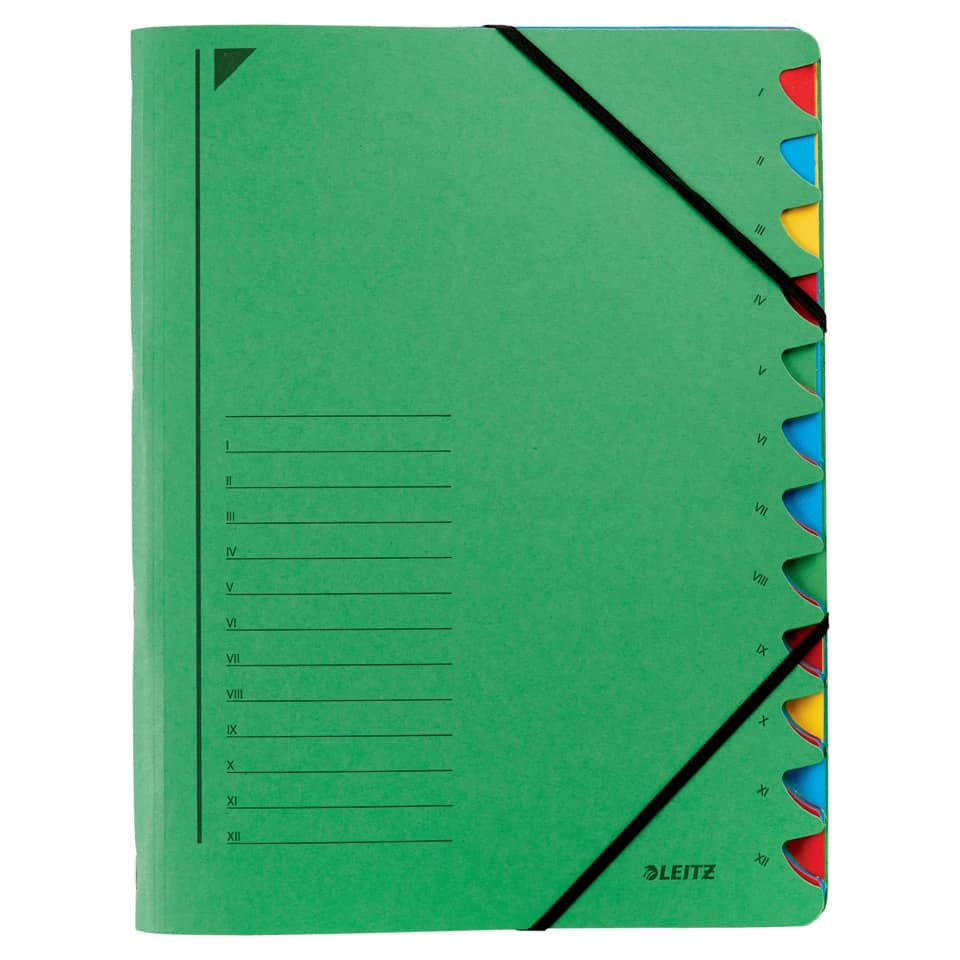 Leitz Ordnungsmappe mit 12 Fächern. Einband aus hochwertigem 430 g/qm zu 100 % recyceltem Pendarec-Karton. Fächerblock aus 350 g/qm Pendarec-Karton. Fächer mit fünffarbigen Greifausschnitten. Gummiband über Vorderdeckelecken. Blauer Engel. Größe: 245 x 320 mm (B x H).