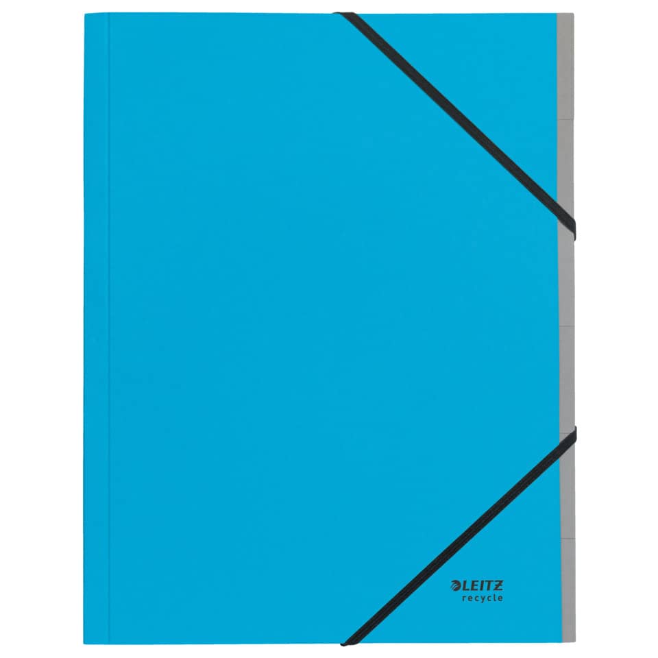 Leitz Ordnungsmappe Recycle. 6 Fächer. Hergestellt aus zu 100% recyceltem Karton und zu 100% recycelbar (nach Entfernen der Gummizüge). Mit Inhaltsverzeichnis auf der Klappe des Rückdeckels innen. Mit elastischen Gummizügen über den Ecken des Vorderdeckels. Kein Verpackungsabfall, Kennzeichnung nur mittels Etikett. Material: Einband: 100% recycelter Karton 430 g/qm (RC), Fächerblock: 100% recycelter Karton 275 g/qm (RC). Format: für DIN A4, 245 x 320 x 20 mm. Farbe: blau.