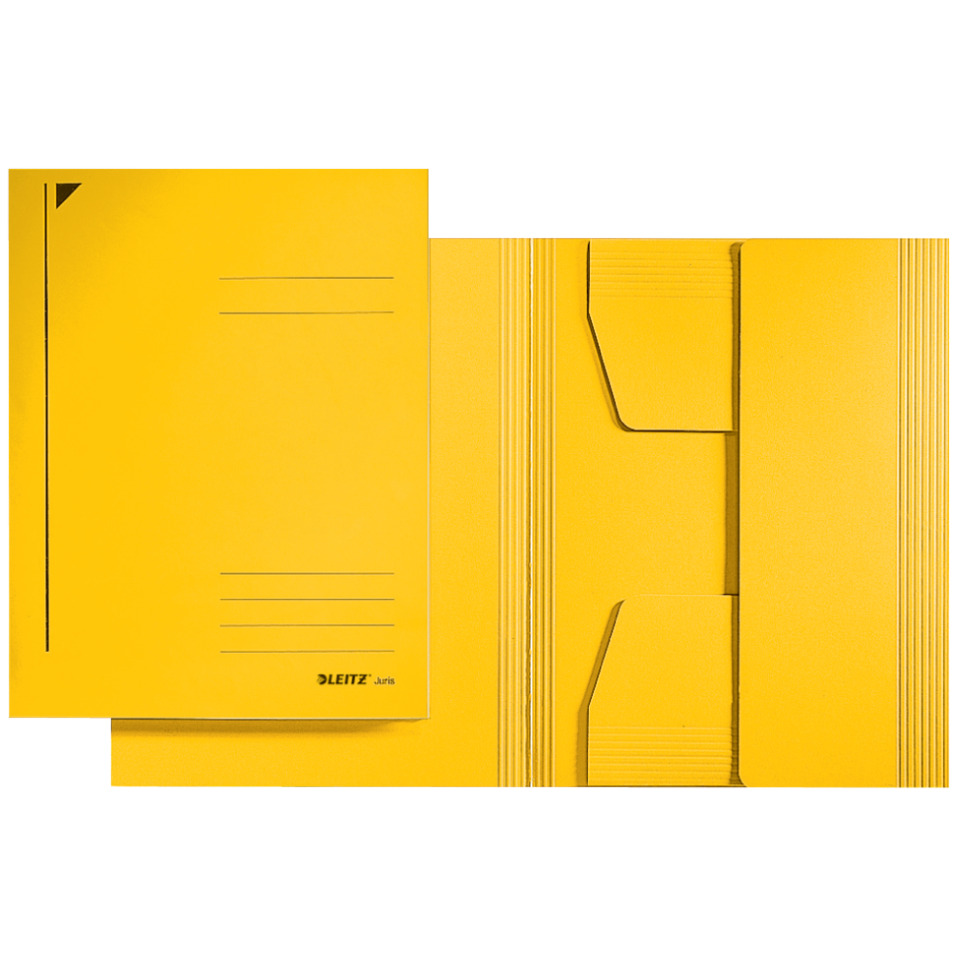 Leitz Jurismappe, A4, mit 3 vollflächig verklebten Klappen am Unterdeckel, Liniendruck auf Vorderdeckel. Material: 100% Pendarec-Karton 430 g/qm (RC). Kapazität: bis zu 250 Blatt A4. Format: 240 x 318 mm. Farbe: gelb.