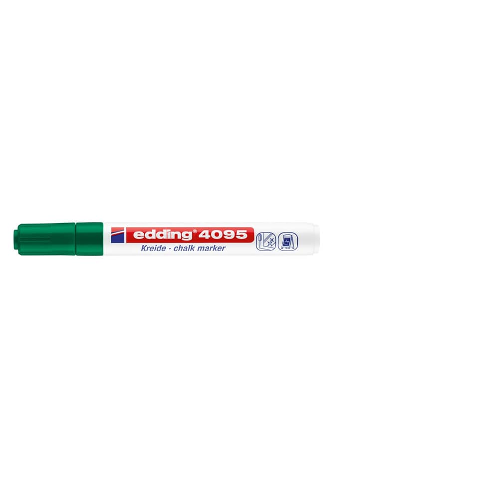 Kreidemarker edding 4095. Fenster-/ Kreidemarker zum Gestalten, Verzieren und Beschriften von Fenstern, Glas, Tafeln und anderen geschlossenen Oberflächen. Gut deckende, geruchsneutrale Flüssigkreide auf Wasserbasis. Feucht abwischbar von fast allen geschlossenen Oberflächen. Rundspitze. Ventilgesteuerter Kreidefluss. Weißer Kunststoffschaft mit Kunststoffkappe in Schreibfarbe. Strichstärke: 2 – 3 mm. Schreibfarbe: grün.