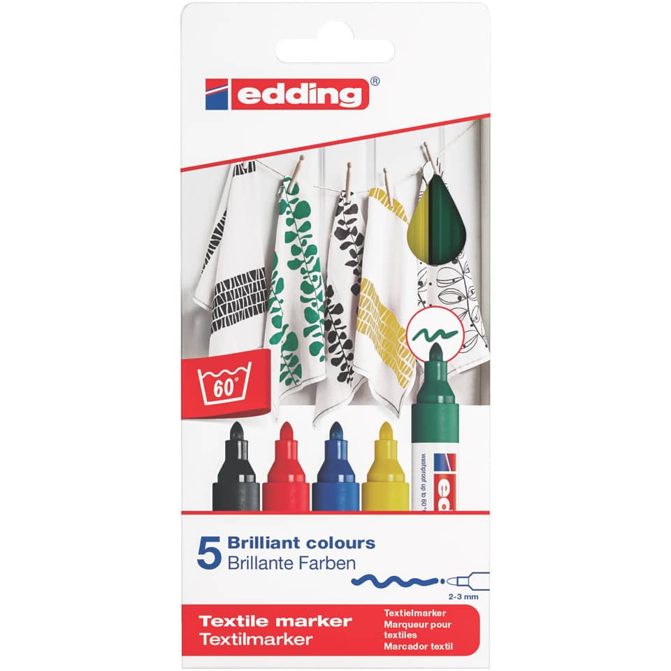 Textilmarker edding 4500 creative. Textilmarker zum Malen, Schreiben, Signieren auf fast allen appreturfreien Textilien. Rundspitze. Lichtbeständige, geruchsneutrale Pigmenttinte auf Wasserbasis. Zum Fixieren ohne Dampf bügeln. Nach dem Fixieren weitgehend waschfest bis 60°C. Weißer Kunststoffschaft. Umsteckbare Kappe in Schreibfarbe. Strichstärke: 2-3 mm. Schreibfarben: schwarz, rot, blau, grün, gelb.