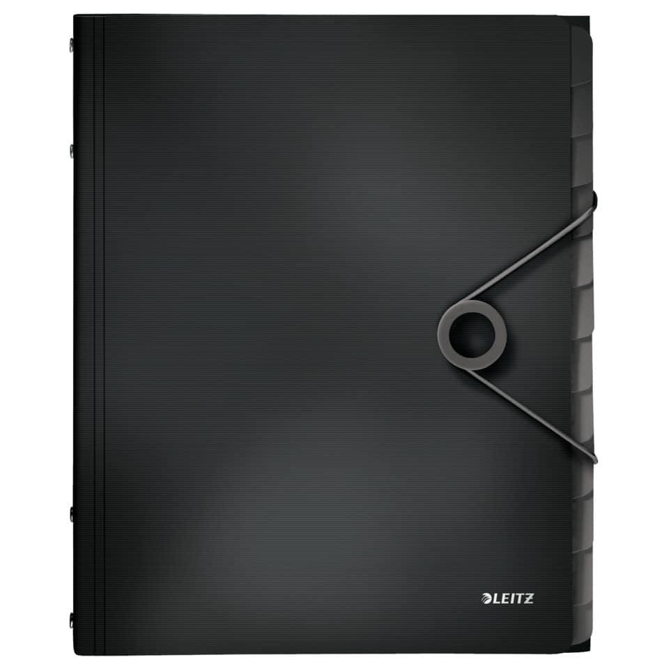 Leitz Ordnungsmappe Solid aus kratzfestem und langlebigem 2-lagigem PP mit unauffälligem Prägemuster. 12 Fächer mit Taben für eine übersichtliche Organisation. Mit drei Schutzklappen am Rückdeckel zur Ablage loser Unterlagen und einem Inhaltsverzeichnis. Moderner, formschöner Verschluss mit Gummizug. Größe (B x H x T): 320 x 260 x 17 mm.