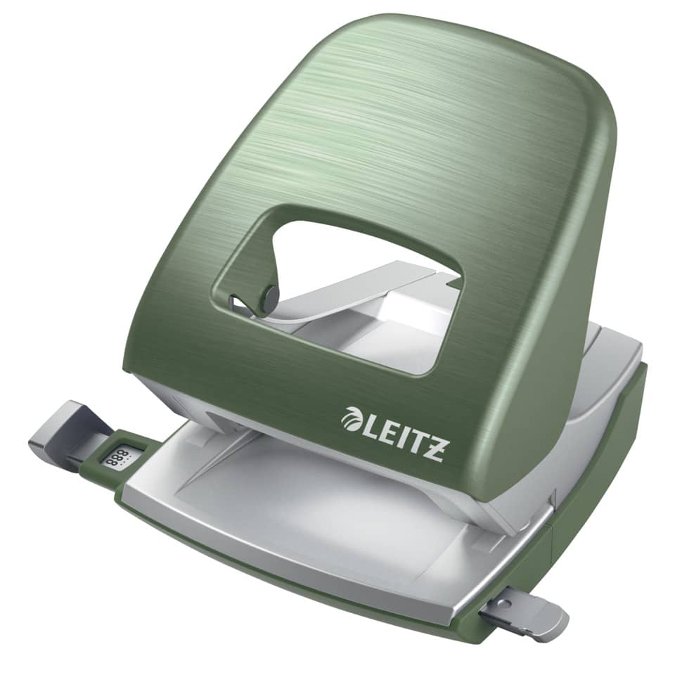 Leitz Bürolocher NeXXt Style, Metall, mit Anschlagschiene aus Kunststoff, mit gebürsteter Metall-Oberfläche und Silber als Kontrastfarbe, Anschlagschiene mit farbiger Bedruckung und Fenster. Mit transprarentem, rutschfestem Kunststoffboden (Abfallkasten), mit patentierter Griffmulde und ultra-scharfen Lochstempeln, auch für 4-fach Lochung geeignet. Stanzleistung/Blatt: 3 mm/30. Material: Metall. Farbe: seladon grün.
