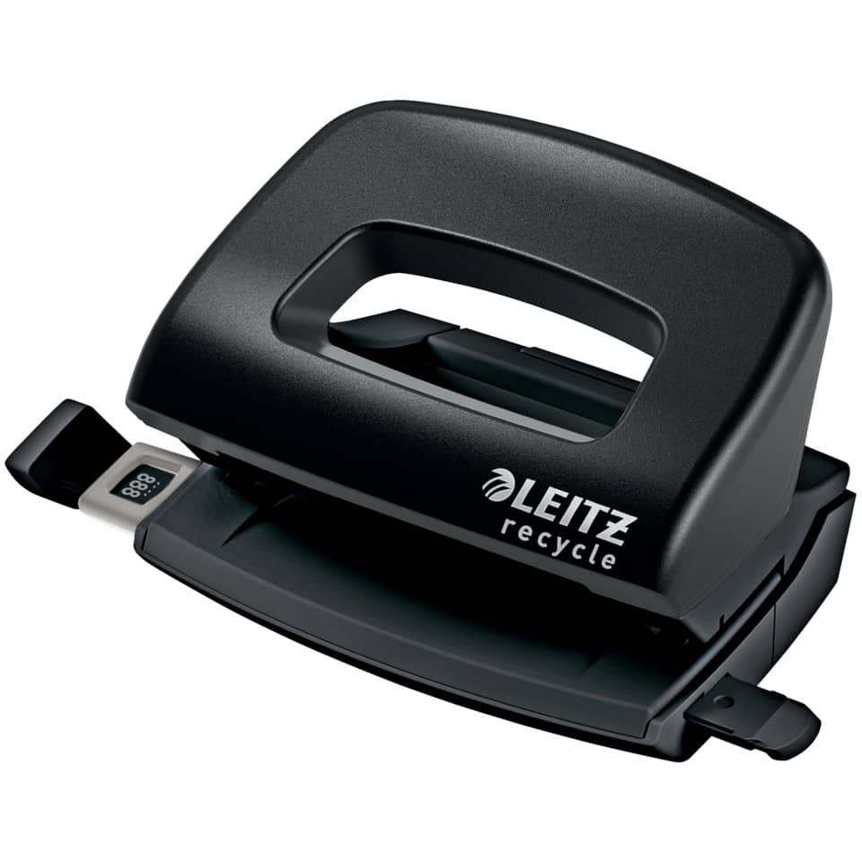 Leitz Locher Mini NeXXt Recycle. Hergestellt aus 50% recyceltem Kunststoff, 100% recycelbar, da es mit Hilfe eines Schraubendreher vollständig in die verschiedenen Materialtypen zerlegt werden kann. Mit Anschlagschiene. Anschlagschiene mit farbiger Bedruckung und Fenster. Mit transprarentem, rutschfestem Kunststoffboden (Abfallkasten), ergonomisch geformter Griffbereich, mit scharfen Lochstempeln, auch für 4-fach Lochung geeignet. Umweltfreundliche Verpackung aus 67% recyceltem Karton, vollständig recycelbar. Stanzleistung/Blatt: 1 mm/10. Material: 50% recycelter Kunststoff, Metall. 3 Jahre Garantie, GS-geprüft. Farbe: schwarz.
