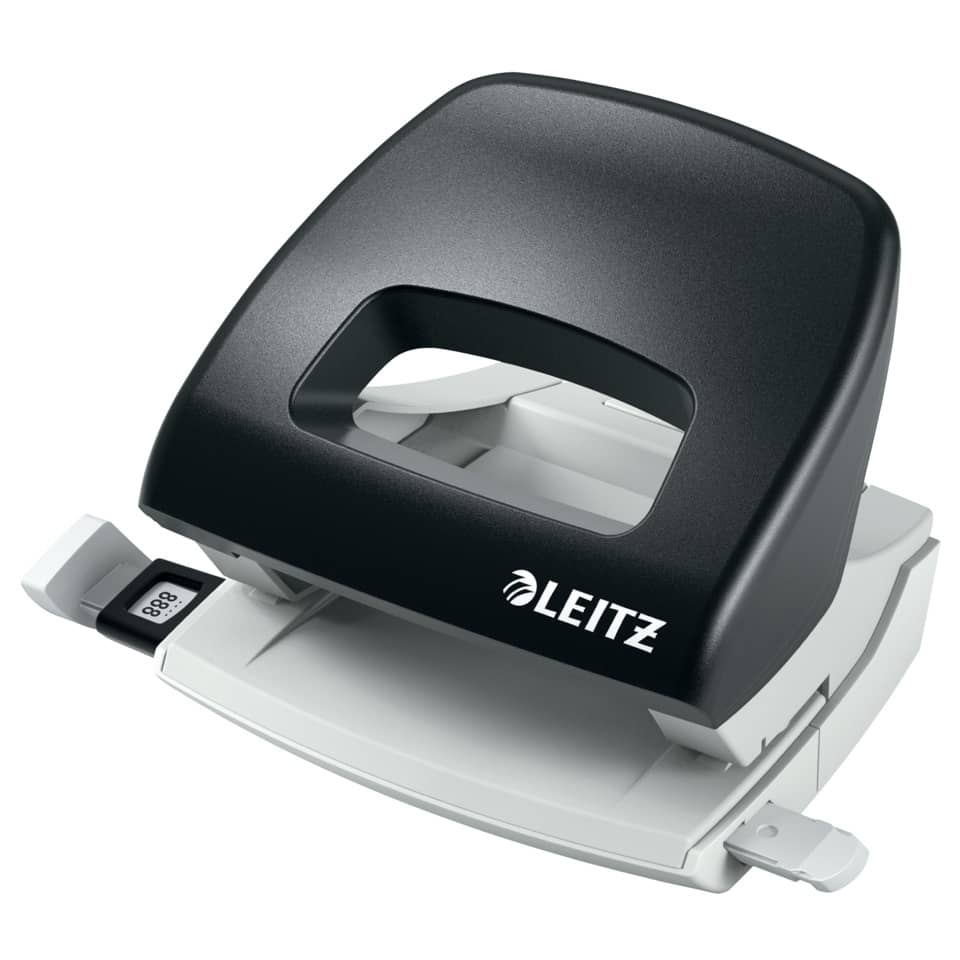 Bürolocher Klein NeXXt, mit Anschlagschiene aus Kunststoff, Anschlagschiene mit farbiger Bedruckung und Fenster. Mit transprarentem, rutschfestem Kunststoffboden (Abfallkasten), ergonomisch geformter Griffbereich, mit ultra-scharfen Lochstempeln, auch für 4-fach Lochung geeignet. Stanzleistung/Blatt: 1,6 mm/16. Material: Metall mit Kunststoff. Farbe: schwarz.