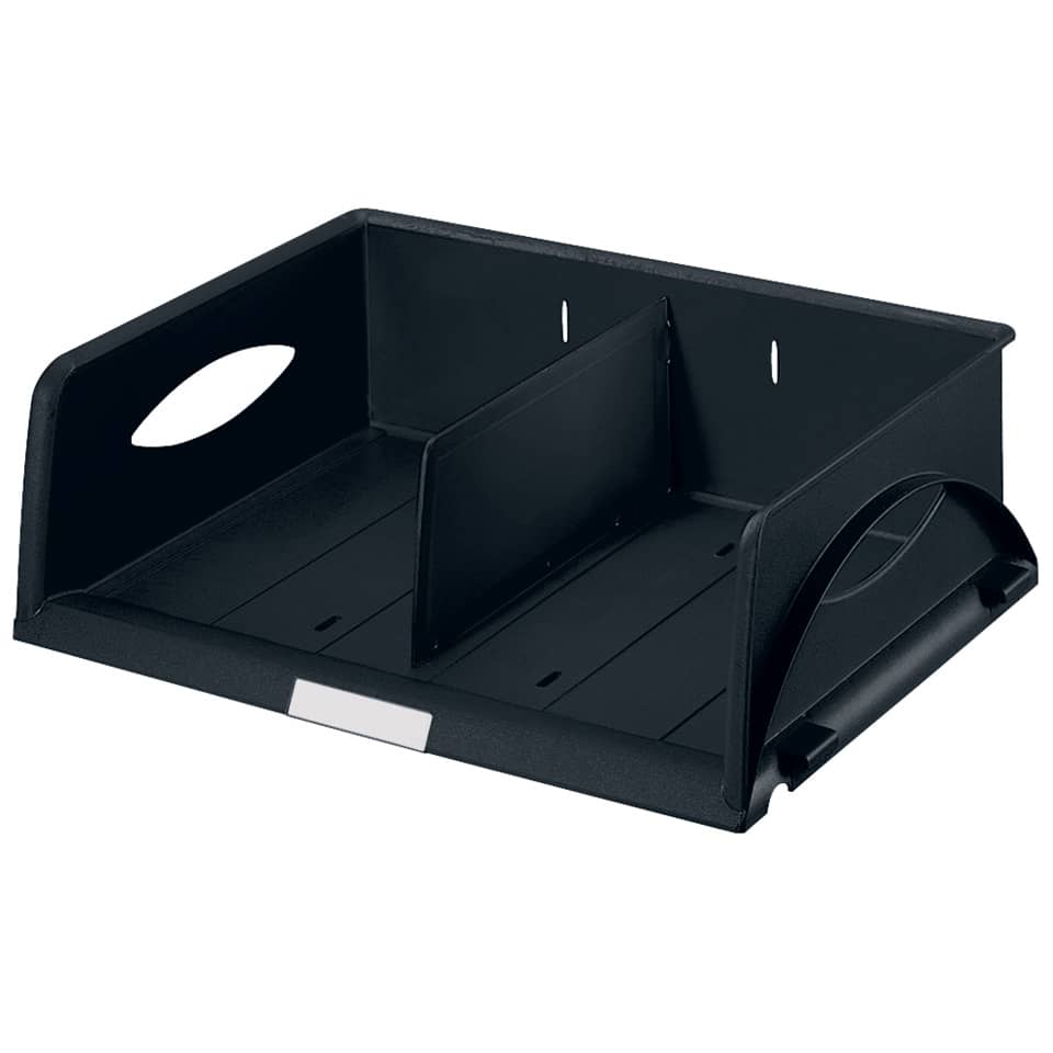 Leitz Briefkorb Sorty. Mehrfach übereinander stapelbar, mit grau-transparenter, auswechselbarer Trennwand und Beschriftungsschild. Material: Polystyrol (PS). Für A4- und C4-Querformate. Format: 408 x 295 x 127 mm. Farbe: schwarz. Zweifache Unterteilung für z. B. DL-Formate möglich. Lieferung inkl. einer Trennwand.