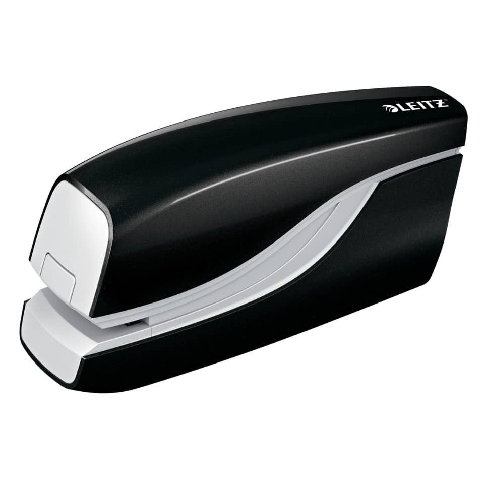 Leitz Elektrisches Heftgerät WOW mit Springfachmechanik, für geschlossene Heftung, Batteriebetrieb (4 x AA Batterien, nicht im Lieferumfang enthalten). Material: Metall mit Kunststoff. Einlegetiefe: 10 mm. Heftklammern: 100 x e1. Farbe: schwarz metallic.