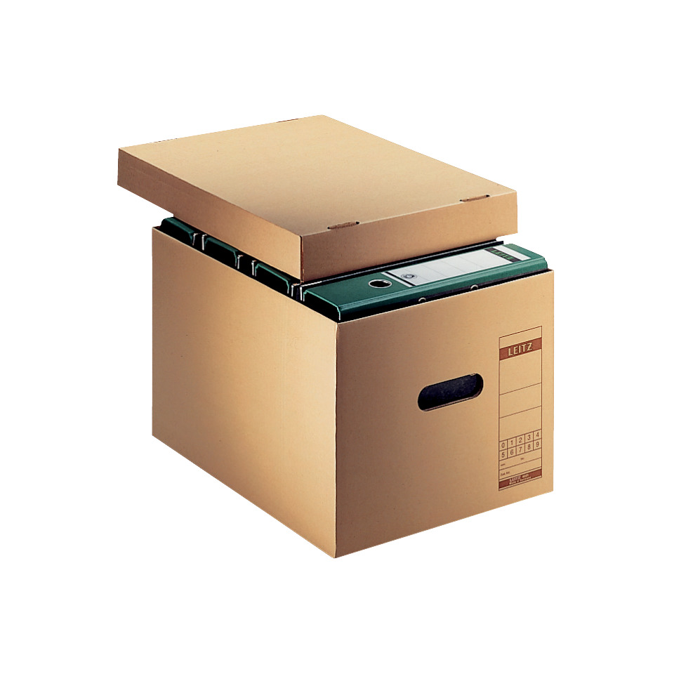 Leitz Archiv-Schachtel, A4, mit Deckel, eingestanzten Handgriffen und Bodenplatte. Für Ordner, übereinander stapelbar, flachliegend verpackt. Material: Wellpappe (RC), mit Natronpapier kaschiert. Rohstoff zur Herstellung aus verantwortungsvoller, nachhaltiger Forstwirtschaft. Füllvermögen: 4-7 Ordner. Format: 335 x 280 x 440 mm. Farbe: naturbraun.