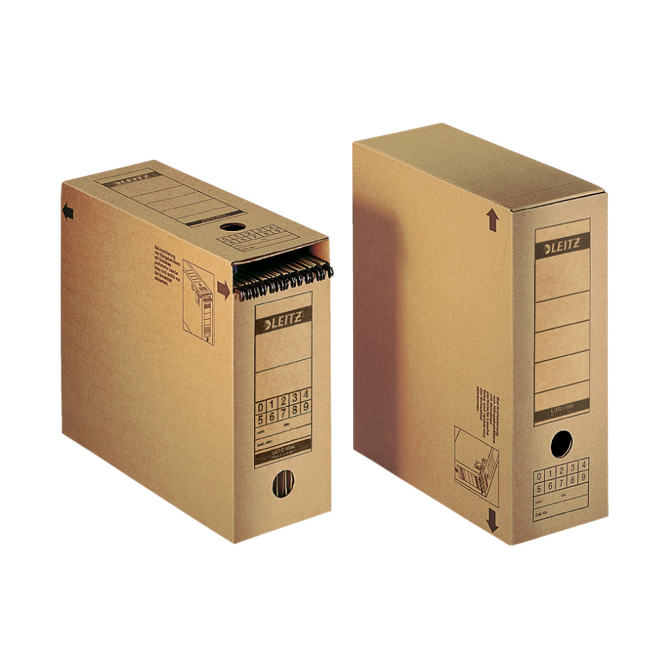 Leitz Archiv-Schachtel, A4, mit Verschlussklappe. Bei Abstellung im Querformat können auch Hängebehälter mit Reiter und Schienen abgehängt werden. Mit Griffloch und Archivdruck für Hoch- und Querformat, flachliegend verpackt. Material: Wellpappe (RC), mit Natronpapier kaschiert. Rohstoff zur Herstellung aus verantwortungsvoller, nachhaltiger Forstwirtschaft. Füllvermögen: 116 mm. Format: 120 x 275 x 325 mm. Farbe: naturbraun.