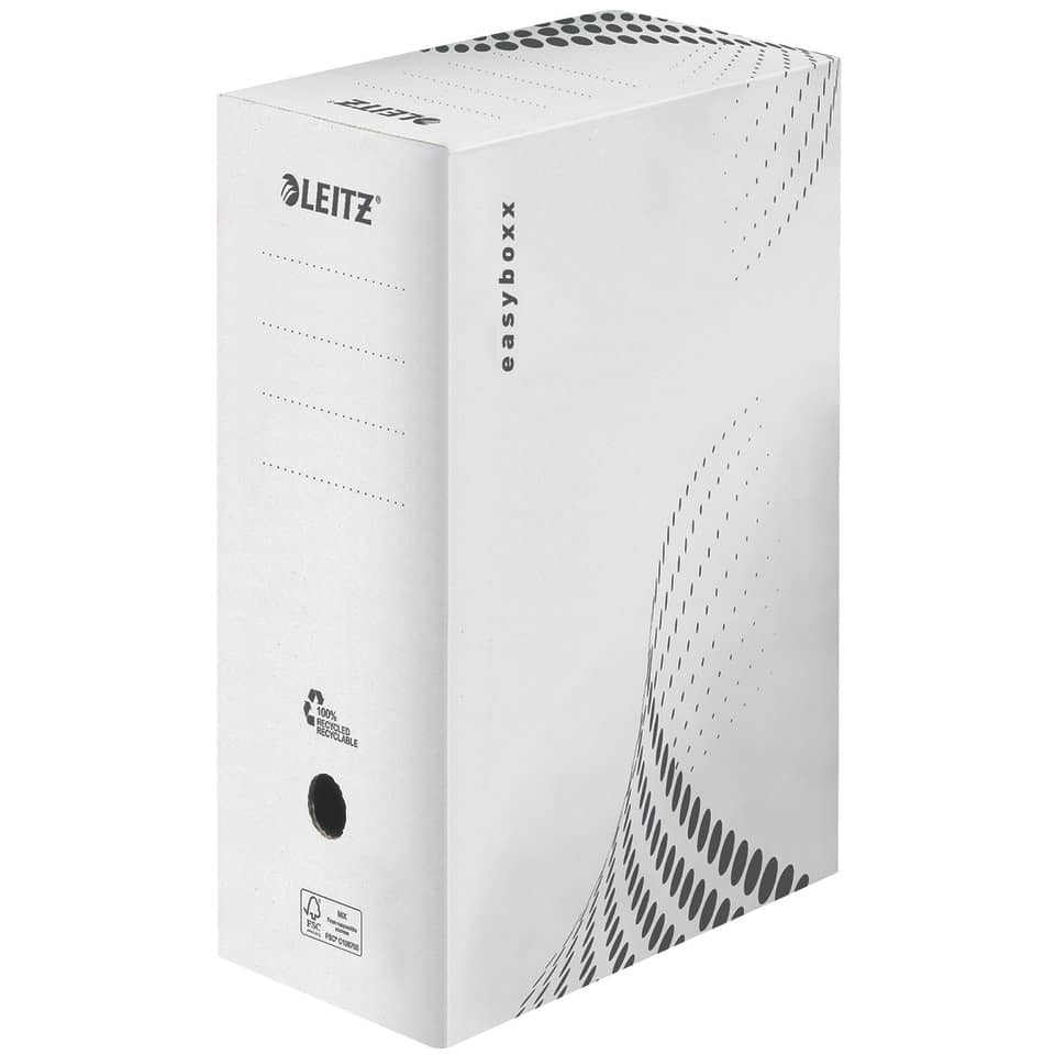 Leitz Archivbox easyboxx 150mm. Für A4 und Folioformat. Mit Verschlußlasche, die unbeabsichtigtes Öffnen vermeidet und das Griffloch verstärkt. Geeignet für Hoch- und Querformat. Mit Automatikboden für einen schnellen und bequemen Aufbau. Mit Beschrifungslinien. Für 1400 Blatt Papier. Lieferung flach liegend. Material: 100% Wellpappe (RC), 100% recycelbar. Format Außenmaß: 150 x 250 x 350 mm. Farbe: weiß.