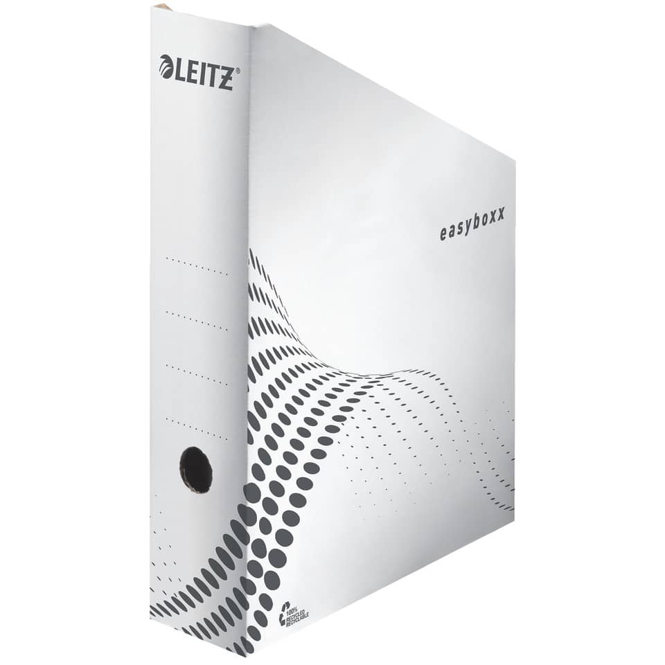 Leitz Archiv-Stehsammler easyboxx 80mm. Für DIN A4. Geeignet für Hoch- und Querformat. Mit Automatikboden für einen schnellen und bequemen Aufbau. Mit Beschriftungslinien. Für 700 Blatt Papier. Lieferung flach liegend. Material: 100% Wellpappe (RC), 100% recycelbar. Format Außenmaß: vorne 260 x 80 x 170 mm, hinten 260 x 80 x 320 mm. Farbe: weiß.