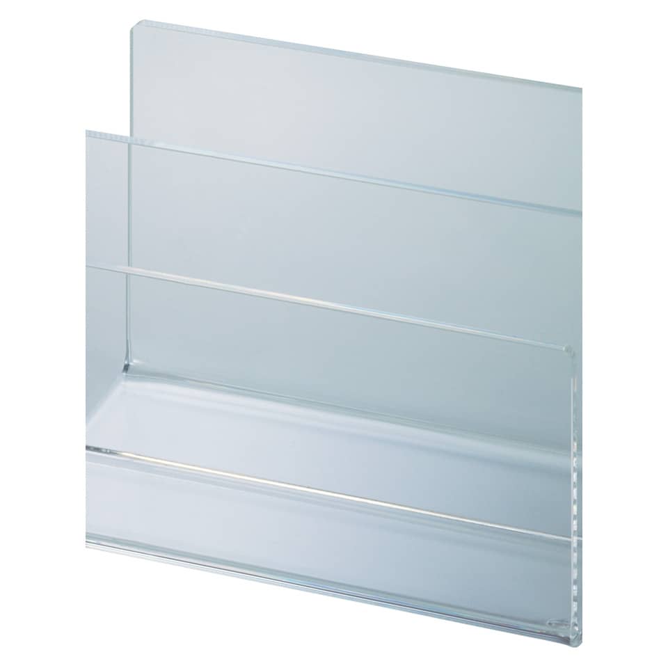 Brief-, Kartenständer Acryl-Kartenständer. Anzahl der Fächer: 2 Stück. Ausführung: Acryl. Das anspruchsvolle Fertigungsverfahren sichert lange Lebensdauer und hohe Stabilität. Mit 2 Fächern. Inklusive Haftnoppen. Materialstärke 0,4 cm. Größe (B x H x T): 151 x 100 x 98 mm. Farbe: glasklar.