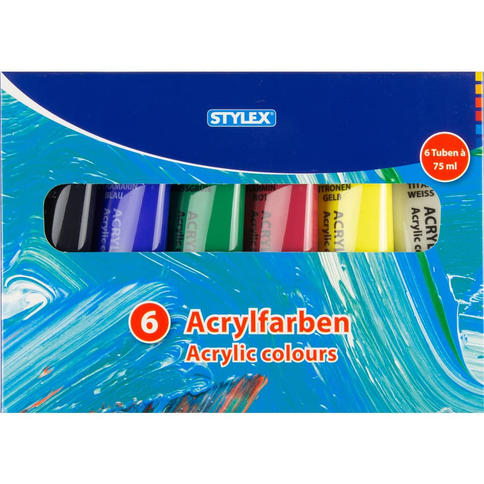 Hochpigmentierte Acrylfarbe auf Wasserbasis hergestellt. Im trockenen Zustand wasserfest. Wasserverdünnbar und mischbar, Farbe ist gut deckend. 6er Geschenkkarton Acrylfarben, Tuben á 75 ml, matt, 6 verschiedene Farben.