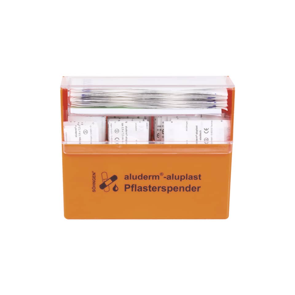 Spender gefüllt mit 115 aluminiumbedampften aluderm®-aluplast Wundverbandpflastern, elastisch, in den fünf am häufigsten benötigten Größen:- 30 Strips 72 x 25 mm – 30 Strips 72 x 19 mm – 25 Fingerkuppenverbände – 20 Fingerverbände 120 x 20 mm – 10 Fingergelenkverbände – Miniblock Notfallversorgungsnachweis – Spender aus ABS-Kunststoff einschließlich Wandhalterung und Befestigungssatz – Maße: 160 x 122 x 57 mm – Korpus orange, mit drei Fachabteilungen, transparenter Klappdeckel mit Tunnelfach – Durch seine Wandhalterung hat der Spender einen festen Aufbewahrungsplatz, langes Suchen entfällt – Er kann mit einem Griff schnell entnommen werden und so überall verfügbar sein aluderm®-aluplast ist das besondere Wundverbandpflaster mit aluminiumbedampfter aluderm®-Wundauflage. aluderm® verklebt nicht mit der Wunde, fasert nicht, ist stark saugend, kann bei der Hautbildung und Heilung helfen, ist atmungsaktiv. aluderm®-aluplast elastisch: Trägermaterial hochelastisches Polyestervlies, weiß, besonders hautfreundlich, gut luftdurchlässig, wasserabweisend. Der Polyacrylatkleber wird durch Körperwärme zusätzlich aktiviert. Besonders anschmiegsam, passt sich allen Bewegungen an, hypoallergen, reizfrei.