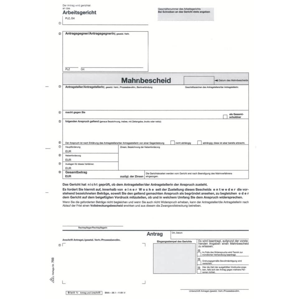 Für das Mahnverfahren in arbeitsrechtlichen Angelegenheiten sind die Arbeitsgerichte zuständig, die das manuelle Mahnverfahren durchführen. Zur Antragstellung müssen der vorbereitete Mahnbescheid und der vorbereitete Vollstreckungsbescheid an das zuständige Arbeitsgericht übersandt werden. Das Ausfüllen des Vordrucks wird durch umfangreiche Erläuterungen und ein Entwurfsblatt vereinfacht.