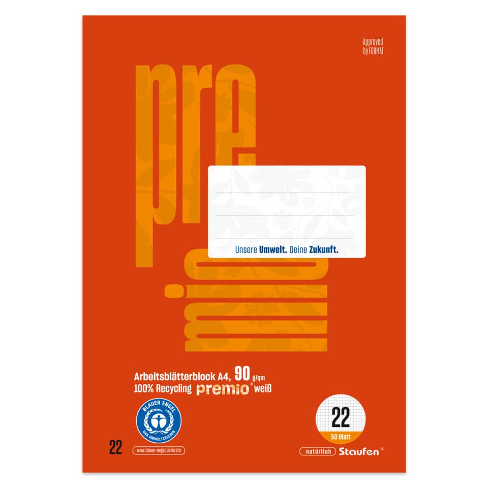 Qualität mit dem Umwelt-Extra! Das exklusive premio® Sortiment wird aus 100% recycletem Papier unter den strengen Auflagen des Blauen Engels und des EU Ecolabels hergestellt. Die erstklassige Beschaffenheit und das hochweiße 90 Gramm Papier sorgen für ein angenehmes Schreibgefühl und eine herausragende Opazität. Geschützt wird jedes Produkt durch Deckblätter bzw. Umschläge mit hoher Grammatur, im eleganten Design der modernen permio® Farbenwelt. premio® ist DER umweltfreundliche Begleiter in Schule und Büro.