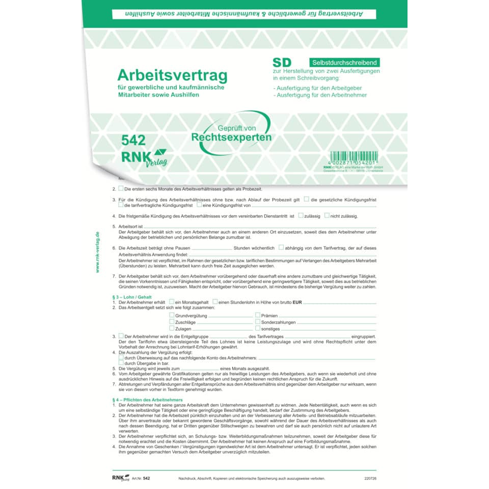 Mit diesem selbstdurchschreibenden Arbeitsvertrag für alle Lohnempfänger wird das Arbeitsverhältnis umfassend geregelt.