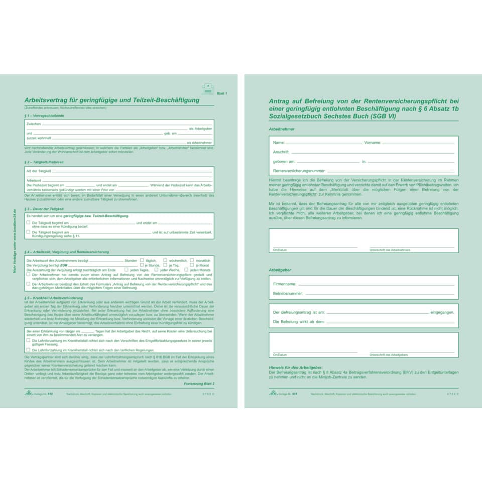 Seit dem 01. Januar 2013 gilt neben der erhöhten Verdienstgrenze für Mini- und Maxijobber eine generelle Rentenversicherungspflicht für Minijobber. Dabei ist der Arbeitgeber in der Pflicht, seinen Mitarbeiter über die Möglichkeiten aufzuklären. Zur Umsetzung dieser Pflicht enthält der Vertrag ein Zusatzblatt mit einem Merkblatt für den Arbeitnehmer und dem Formular für den Antrag des Arbeitnehmers auf Befreiung von der Rentenversicherungspflicht.