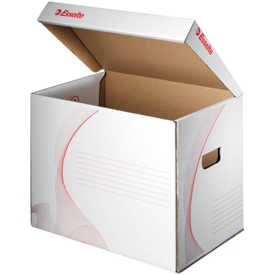 Archivcontainer, mit Klappdeckel, mit Griffloch und Archivdruck für Hoch- und Querformat, Füllhöhe ca. 240mm (z. B. für drei A4 Ordner mit der Rückenbreite von 80mm), flachliegend verpackt. Material: Wellpappe 390 g/qm (RC), säurefrei, mit farbigem Aufdruck.