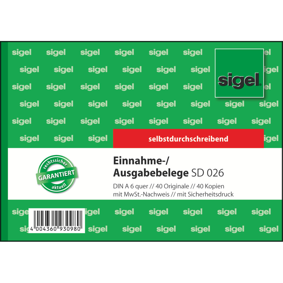 Selbstdurchschreibender Ausgabe-/Einnahmebeleg, Format A6 quer, mit Empfangsbestätigung und MwSt.-Nachweis. Gewünschten Verwendungszweck einfach ankreuzen! Fälschungssicherer Dokumentendruck. Jedes Blatt mit Abheftlochung und ultra-feiner Microperforation für leichtes und sauberes Abtrennen. Formularbuch mit besonders haltbarer Spezial-Rückenleimungund integrierter Schreibunterlage zum Einklappen.