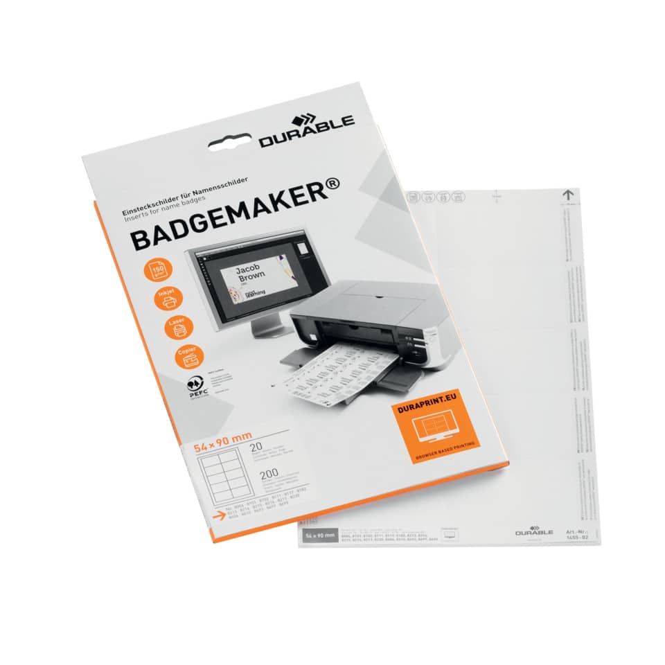 DURABLE BADGEMAKER®, Einsteckschilder 54 x 90 mm, weiß. Mikroperforierte Einsteckschilderbogen in DIN A4 oder DIN A3. Für die professionelle Beschriftung von Namens- und Tischnamensschildern mit Laser- und Tintenstrahldruckern oder Kopierern. Einfaches Beschriften von Namens- und Tischnamensschildern. Verwendbar für Art.-Nr.: 8004, 8023, 8101, 8102, 8111, 8117, 8213, 8214, 8215, 8216, 8217, 8604, 8610, 8693. Produktdetails: Inhalt: 20 Stk. (für 200 Schilder), Maße der Einsteckschilder (H x B): 54 x 90 mm