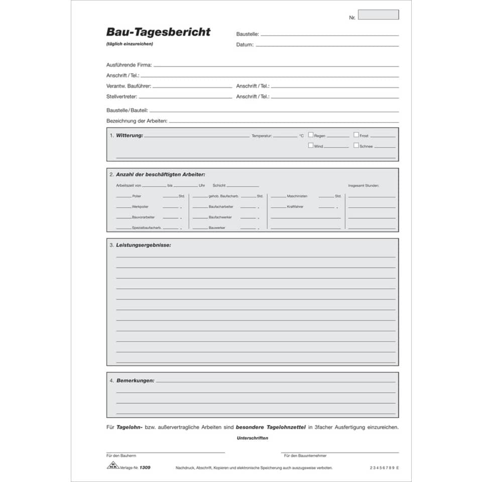 Der Bau-Tagesbericht für den genauen Nachweis ausgeführter Bauleistungen, nach Anzahl der beschäftigten Arbeiter unterteilt in Gewerke, erlaubt auch die Dokumentation der Witterung und detaillierte Angaben zum Leistungsergebnis. 1. Blatt weiß perforiert, 2. Blatt gelb perforiert, 3. Blatt rosa perforiert.