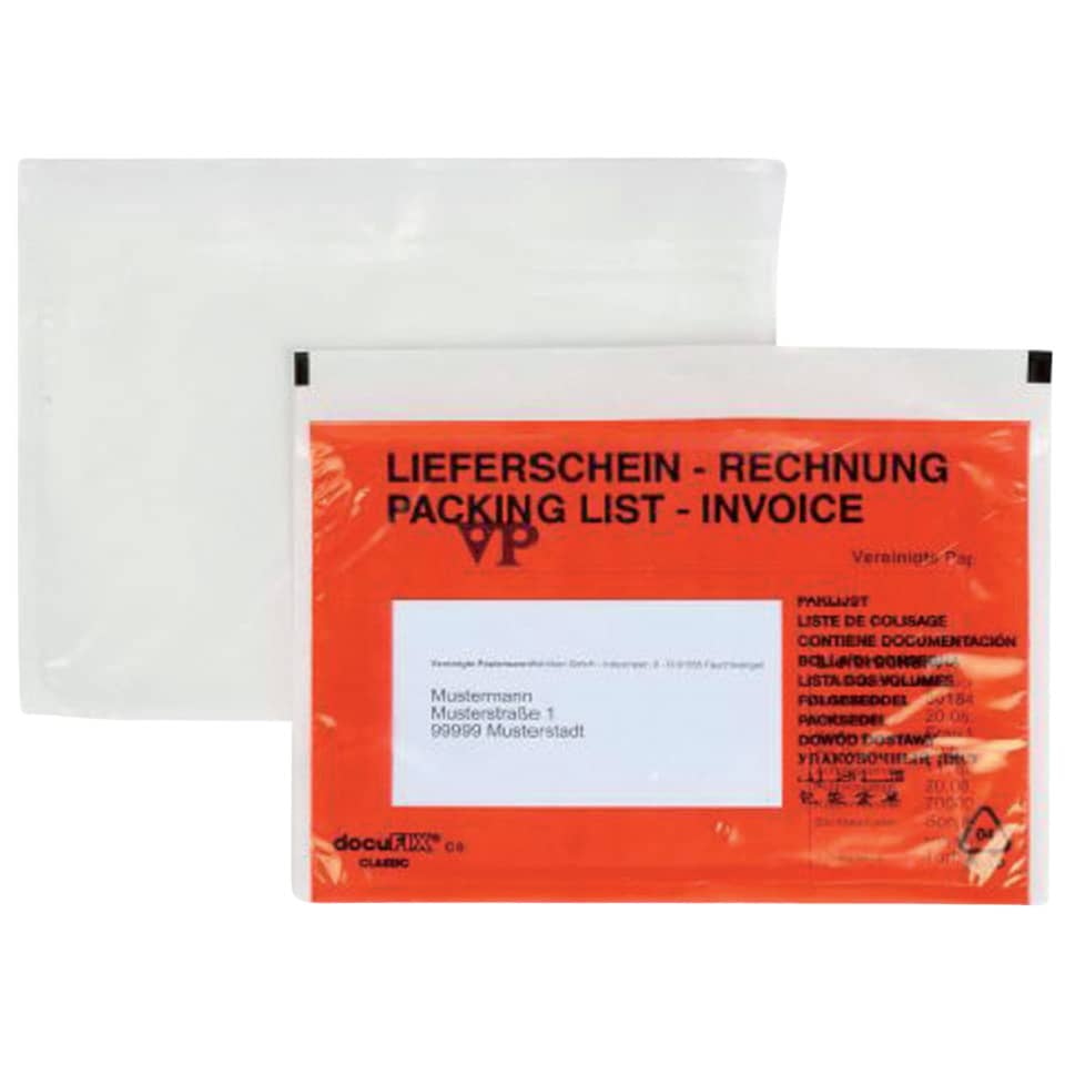Selbstklebend und witterungsbeständig. Verwendungszweck für Versand-, Begleit- oder Lieferscheinpapiere, Schlüssel, Bedienungsanleitungen und Kleinteile. Rechnung/Lieferschein Druck 13-sprachig, entspiegelte Frontfolie für EAN Scanner lesbar. Alle Taschen auf langer Seite offen. Mit selbstklebendem Streifen verschließbar. PG-Inhalt: 250 Stück. Ausführung: Innengröße 16,0 x 11,0 cm Qualität Classic. (Frontfolie/Rückenfolie 35/20 mµ). Ausführung: C6 Lieferschein/Rechnung rot bedruckt.