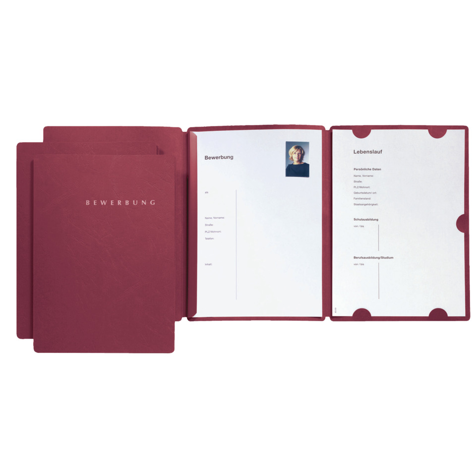 Zweifach aufklappbare Bewerbungsmappe. 3 Klappen mit Halbmondstanzungen halten Anschreiben und Lebenslauf. Die Klemmschiene fasst die Zeugnisse. Aus hochwertigem Karton. Für A4. Schriftzug Bewerbung in silbernen Lettern auf dem Vorderdeckel.