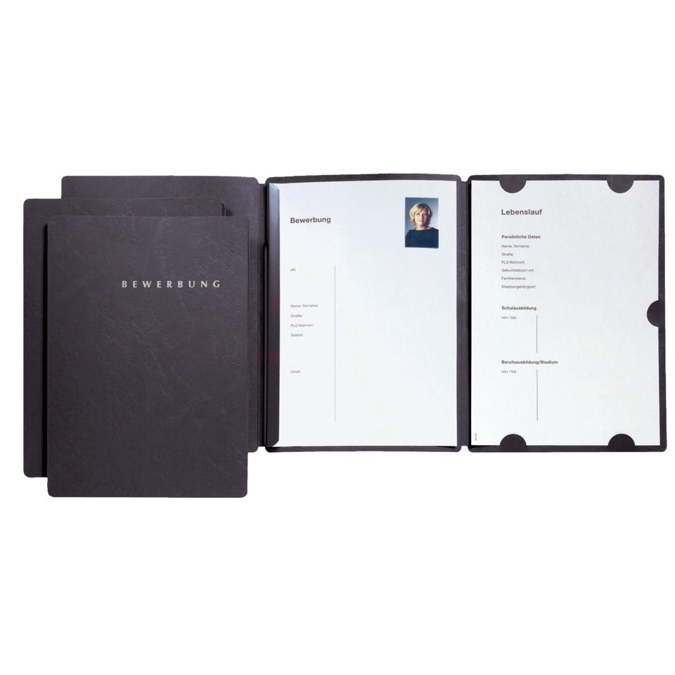 Zweifach aufklappbare Bewerbungsmappe. 3 Klappen mit Halbmondstanzungen halten Anschreiben und Lebenslauf. Die Klemmschiene fasst die Zeugnisse. Aus hochwertigem Karton. Für A4. Schriftzug Bewerbung in silbernen Lettern auf dem Vorderdeckel.