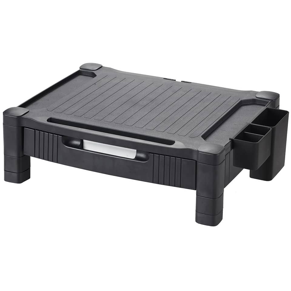 Praktischer Bildschirmhalterung im modernen Design. Der Bildschirmträger kann durch Erhöhung des Bildschirms Nackenschmerzen lindern. Geeignet für Standard und Widescreen Monitore, max. Monitorgröße: 22 Zoll. Mit 1 Aufbewahrungsfach für Stifte, Visitenkarten, USB Sticks, A4 Papier, etc. Das Fach beinhaltet herausnehmbare Unterteilungen zur Sortierung von Kleinteilen. Unter dem Schubfach kann eine flache Tastatur eingeschoben werden. 2 bewegliche, seitlich angebrachte Köcher für die Aufbewahrung von Stifte, Lineal, etc. Tragfähigkeit 20 kg. Größe BxHxT: 434 x 133 x 336 mm. Farbe: schwarz.