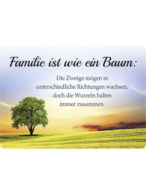Blechpostkarte mit Spruch: Maße: 10,5 x 14,8 cm Familie ist wie ein Baum Die Zweige mögen in unterschiedliche Richtungen wachsen, doch die Wurzeln halten immer zusammen. Blechpostkarte Familie ist wie ein Baum