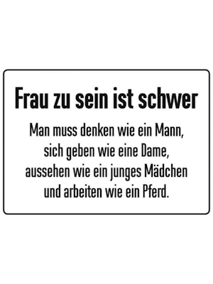 Blechpostkarte mit Spruch: Maße: 10,5 x 14,8 cm Frau zu sein ist schwer Man muss denken wie ein Mann, sich geben wie eine Dame, aussehen wie ein junges Mädchen und arbeiten wie ein Pferd. Blechpostkarte Frau zu sein ist schwer