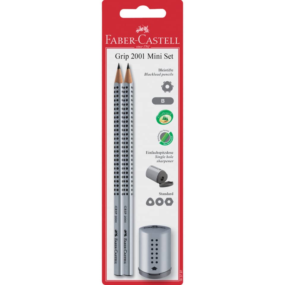 Bleistiftset GRIP 2001 + Einfachspitzer. Ausführung der Schaftform: ergonomische Dreikantform. Gespitzt. Schaft lackiert. Lackierung auf Wasserbasis gegeben. Mit farbig passender Einfachspitzdose mini. Härtegradkennzeichnung vorhanden. Länge: 175 mm. Farbe des Schaftes: silber. Bezeichnung der Härte: B. Ausführung des Inhalts mit Packung: auf Blisterkarte.